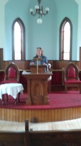 On a mini vacation a few weeks ago with some friends, I found myself behind the pulpit in a very old Presbyterian church in New Glasgow, Ontario. I was pretending to be a preacher. (Call it my second childhood…after all I am eighty-one!) It was a beautiful church with lots of character and for fun I had this picture taken.